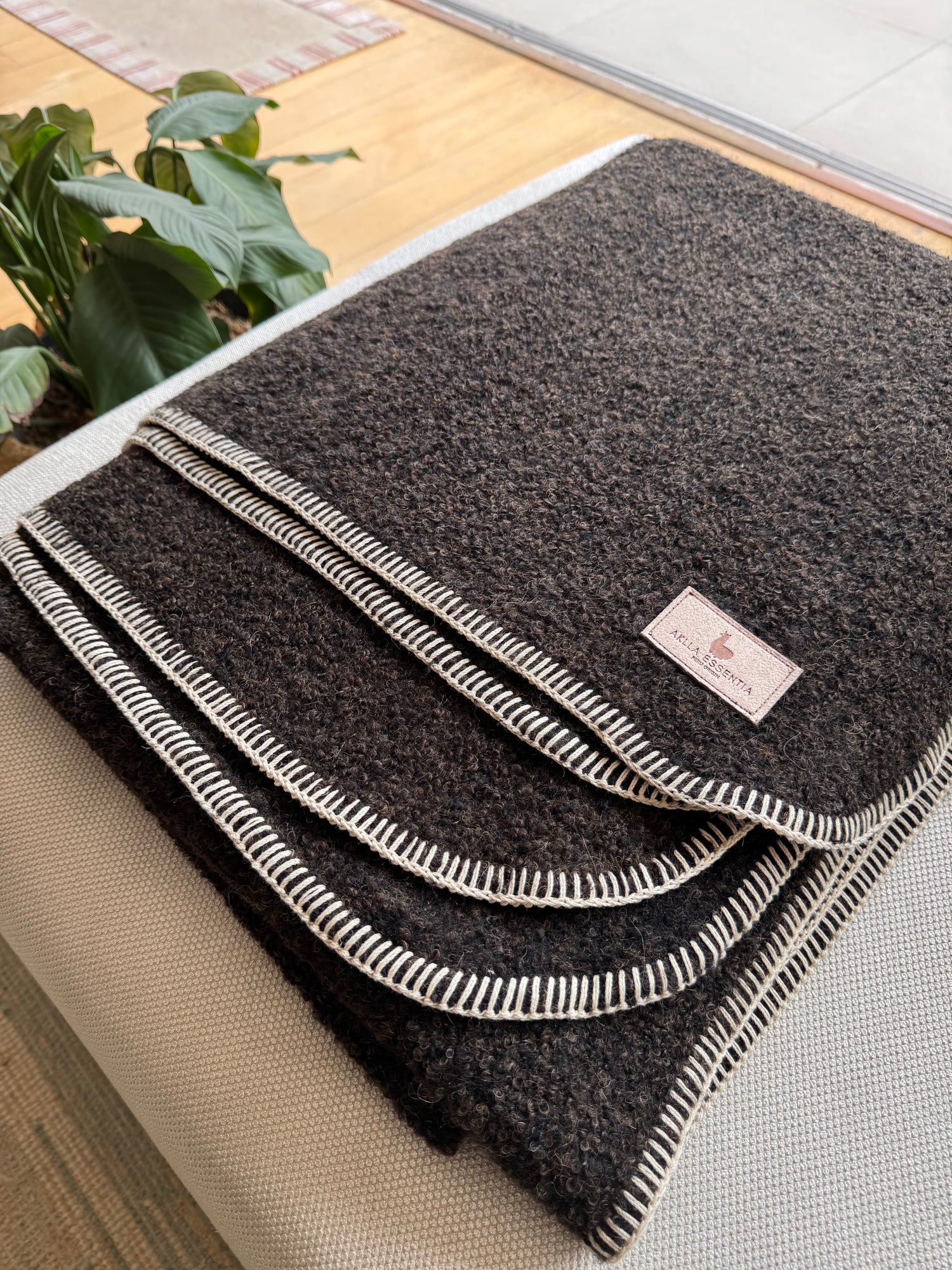 La manta KILLA, cuyo nombre rinde homenaje a la luna en la cosmovisión andina, destaca por su elegancia discreta y su calidez envolvente.